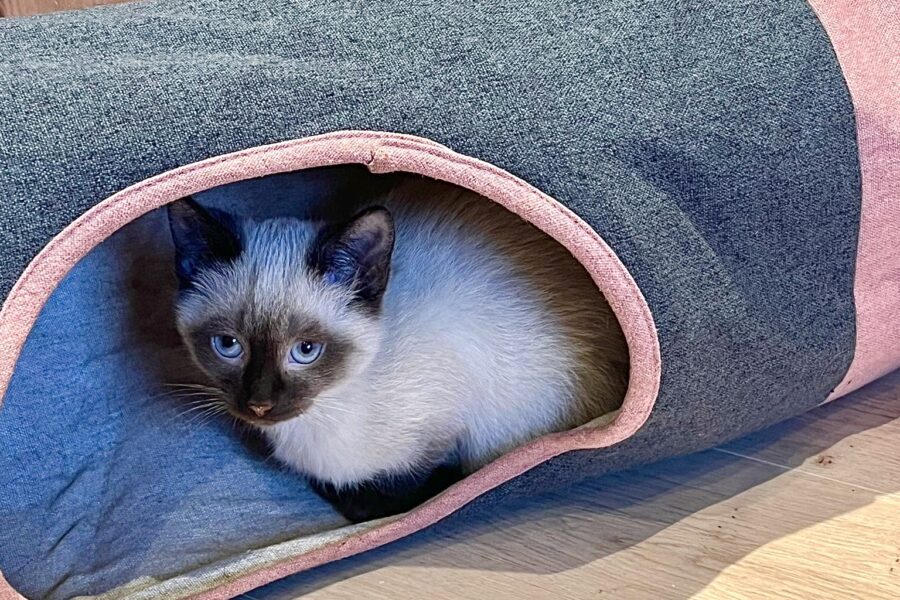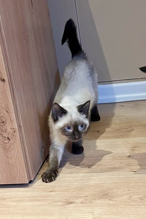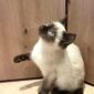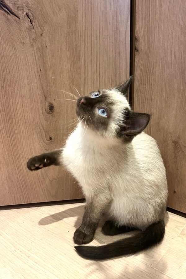 Peach, bei der die rassetypische Siamfärbung zu sehen ist, ist eine zarte Prinzessin, kuschelt am liebsten und beobachtet alles ganz genau.