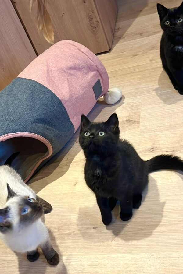 Katzen sind, ganz generell, sehr soziale Tiere, die hohen Wert auf den Kontakt zu ihren Artgenossen legen. Wir möchten es den Jungkatzen nicht aberziehen und vermitteln sie daher nicht in Einzelhaltung.